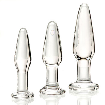 Newbies and pros alike will love this naughty trio of glass anal plugs! Great for training (or re-training) those special muscles for better control, strength and endurance. It’s a pelvic floor workout with many sexual health benefits. Start with the small plug (4.5 by 1.15 inches) and work your way up. Enhance your fun with stimulating tempature play. Flared safety base. Nonporous for easy care. Made from durable borosilicate glass.