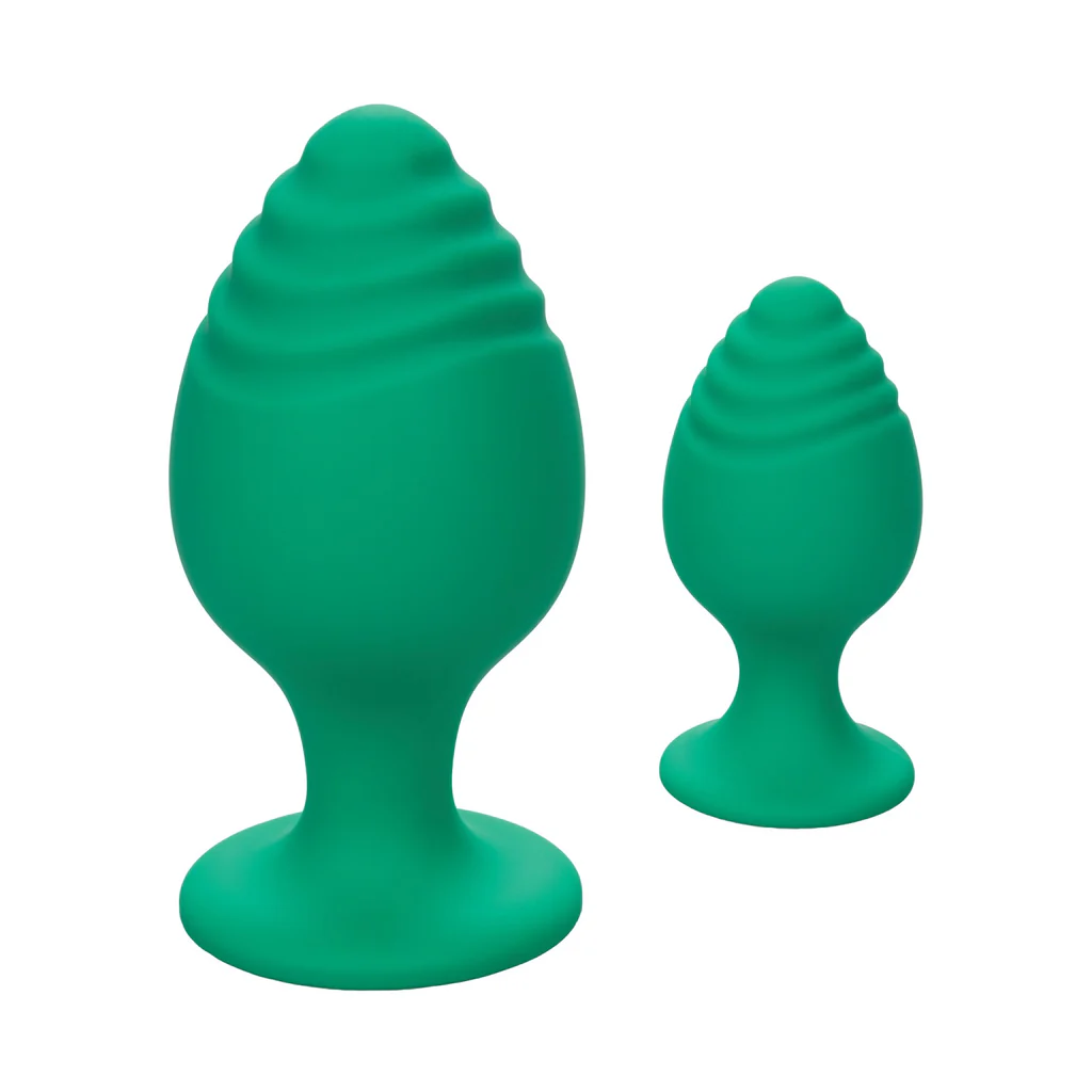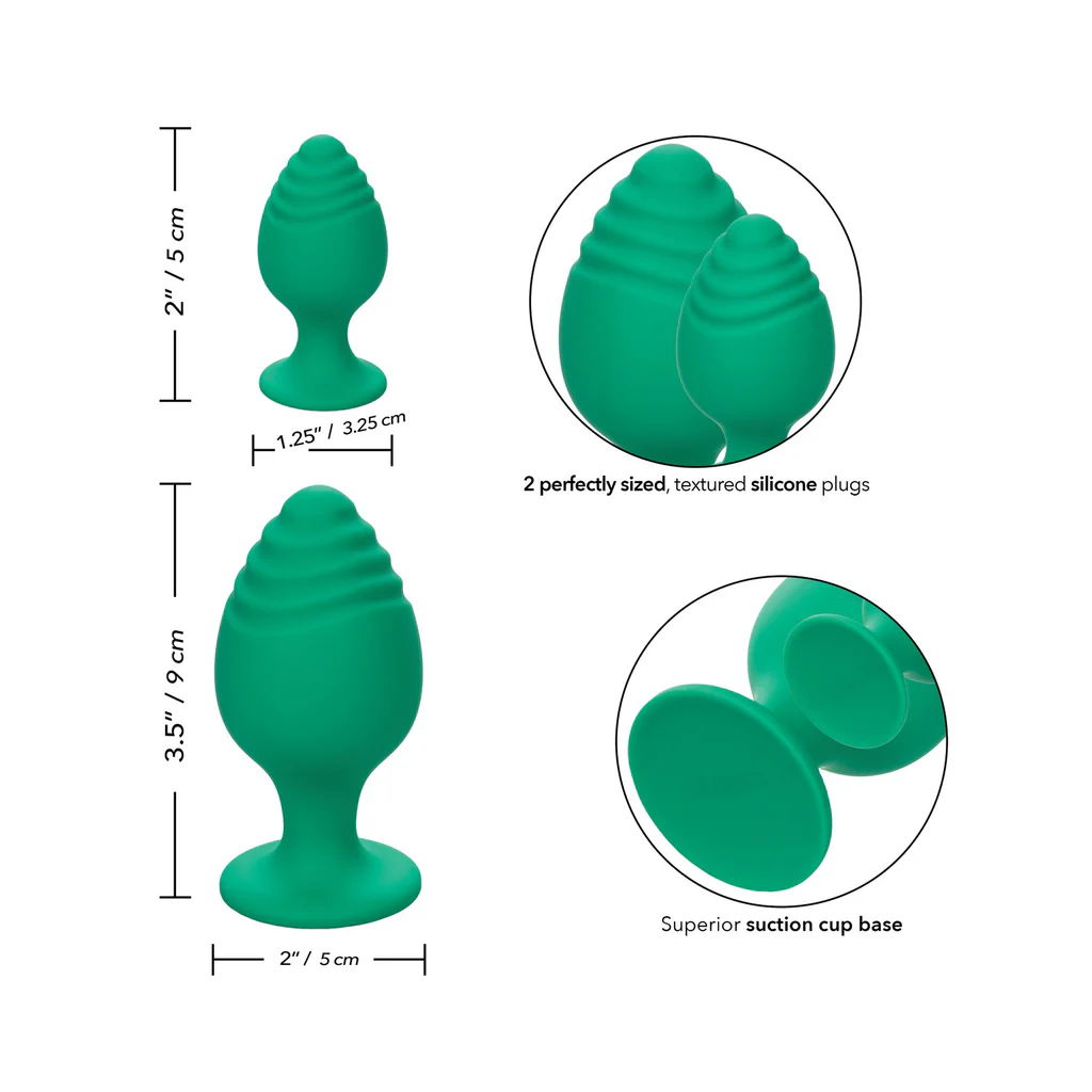 The Cheeky Anal Plug Set includes two body-safe silicone plugs in small (2×1.25″) and large (3.5×2″) sizes, perfect for progressive or experienced play. Each plug features a unique texture for added stimulation, and the flanged suction cup base ensures secure, hands-free use. Waterproof design allows fun in or out of the water, making these plugs ideal for solo or partner play. Start small and work your way up, or enjoy the larger size for more advanced exploration.